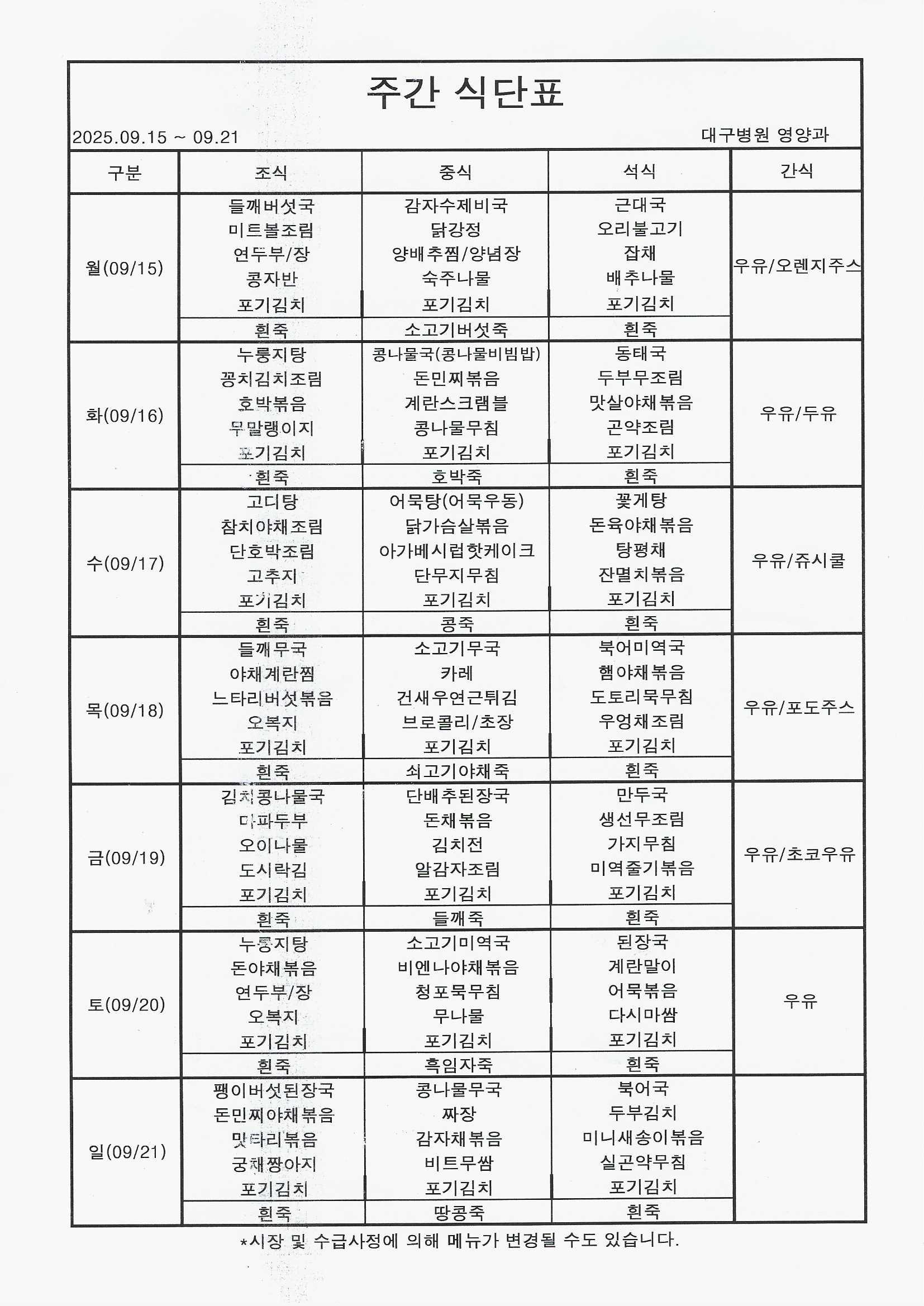 25³â 9/15~9/21 ½Ä´ÜÇ¥