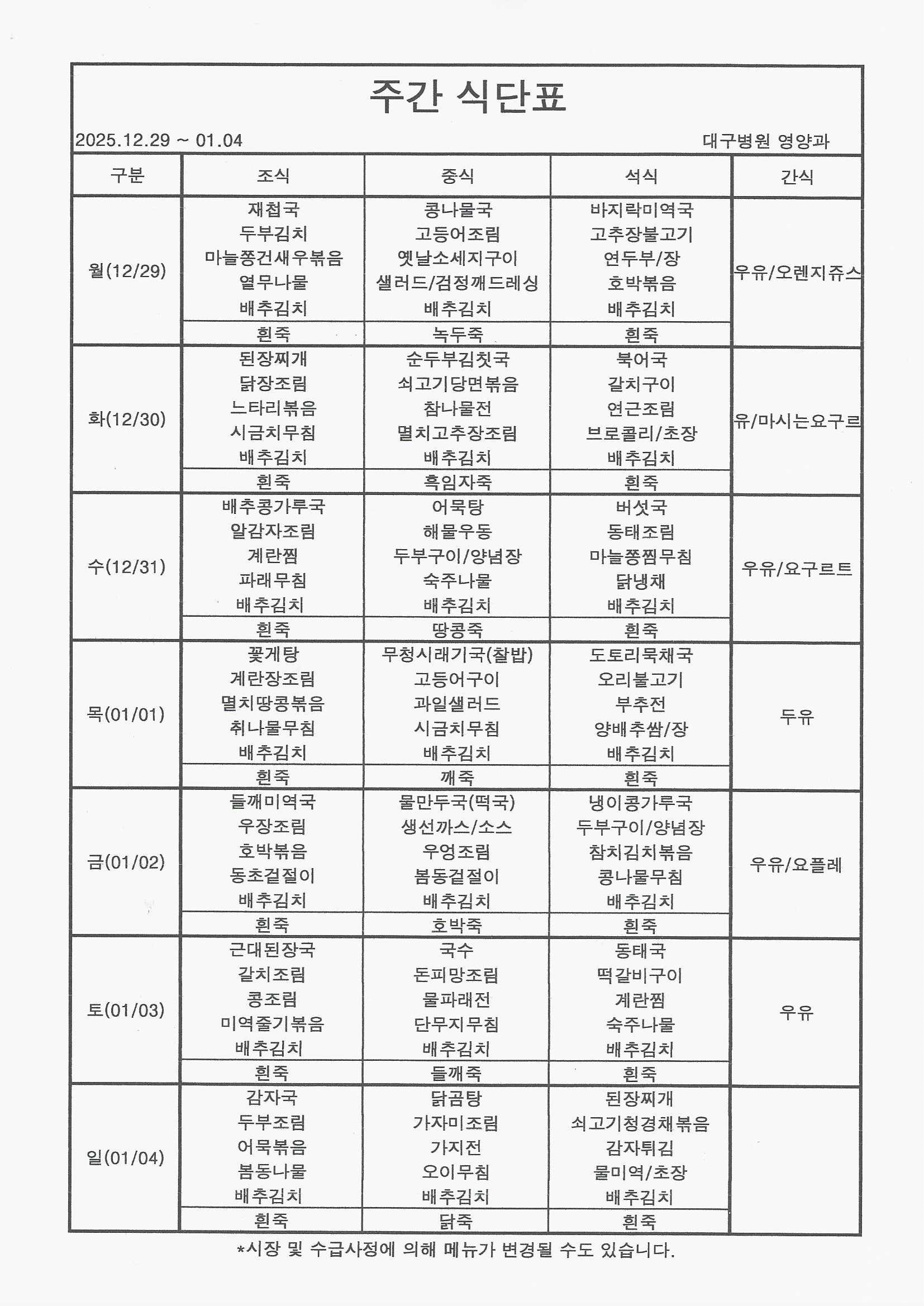 25³â 12/29~26³â 1/4 ½Ä´ÜÇ¥